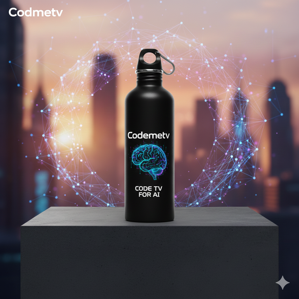 A branded water bottle from Code TV for AI for coders, creators, and future AI builders. Built as a simple daily-use item that represents focus, learning, and the builder lifestyle.